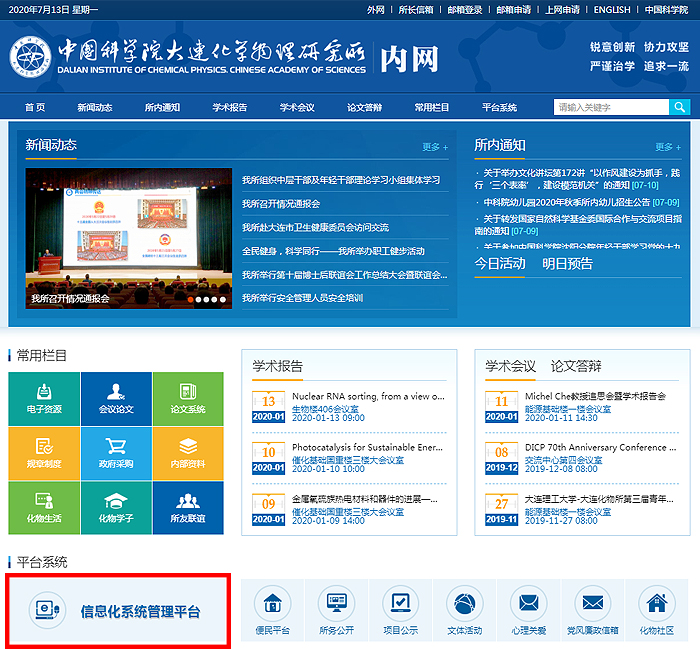 为方便全所用户使用信息化系统,提高工作效率,现对面向全所范围使用的信息化系统进行梳理、分类和整合,将各系统登录入口统一为:http://www.zt.dicp.ac.cn/info/。